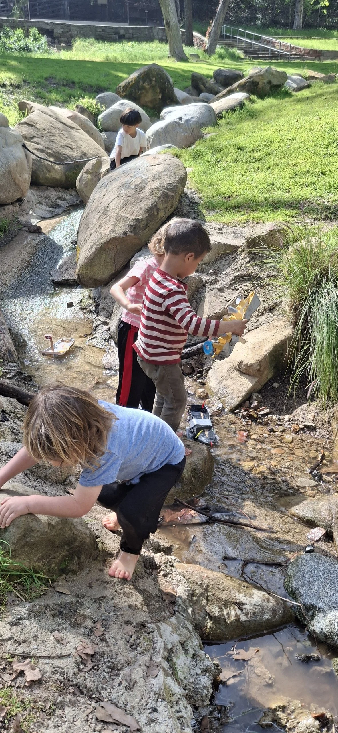 We’re well prepared for rainy days, and children arrive in proper rain gear ready to embrace the mud. When the weather turns especially wet, we gather under the covered structures at Travel Town or create our own tented spaces, continuing to play and learn comfortably outdoors.