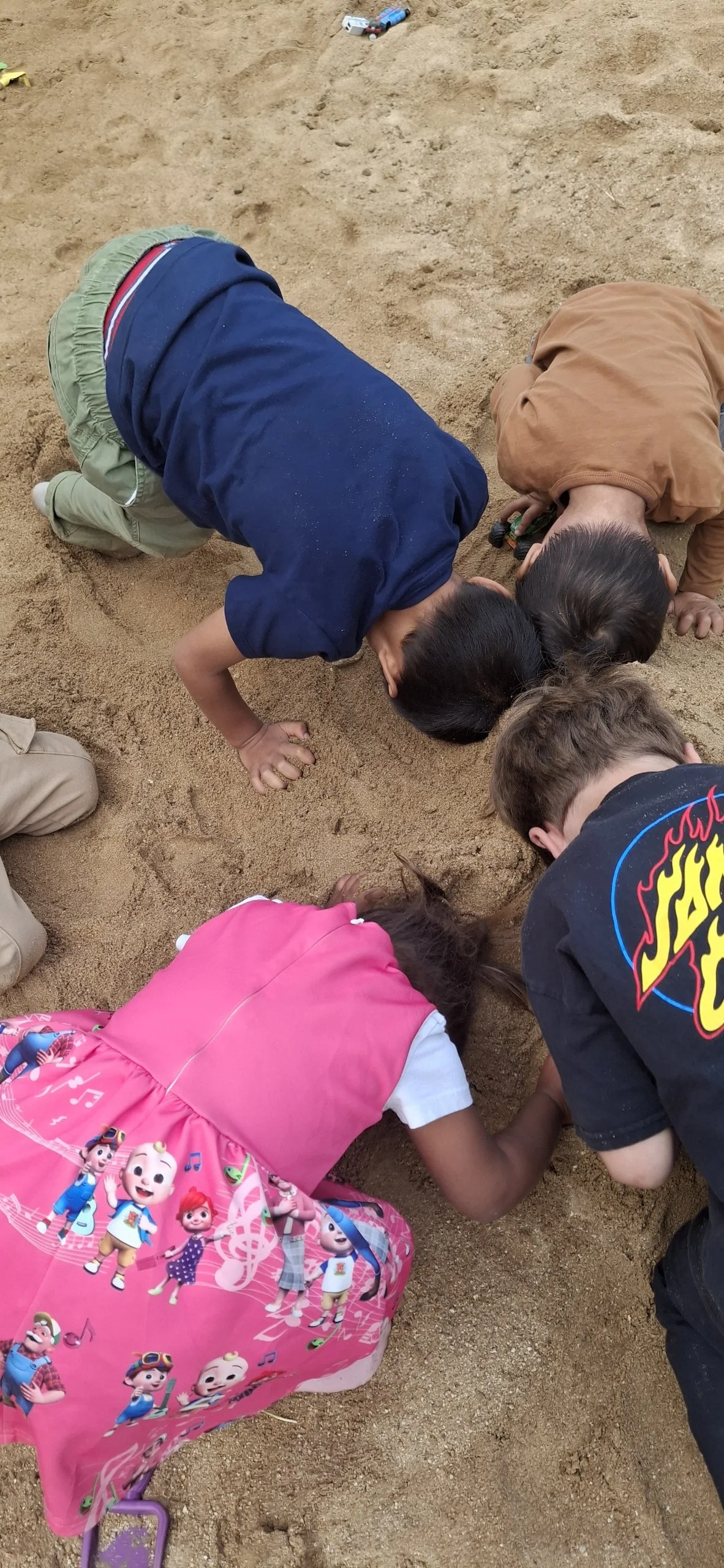 We’re well prepared for rainy days, and children arrive in proper rain gear ready to embrace the mud. When the weather turns especially wet, we gather under the covered structures at Travel Town or create our own tented spaces, continuing to play and learn comfortably outdoors.